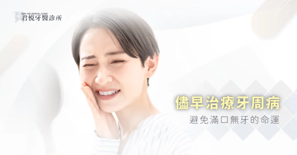牙周受到細菌感染時,在初期僅有刷牙容易出血、牙齦紅腫等輕微症狀,這個階段稱為牙齦炎,隨著病情逐漸惡化,牙齒與牙肉分離所產生的牙周囊袋漸漸加深,慢慢的會演變成牙周炎,此時牙齦紅腫發炎及流血的狀況會更加明顯,且伴隨明顯口臭或化膿,再嚴重點牙肉會開始萎縮,牙根裸露的狀態下牙齒容易變得敏感,而細菌不斷破壞牙周韌帶造成齒槽骨流失,會讓病情變得更為嚴重,像是牙齒縫隙變大及產生位移,咀嚼時也會有無力感,後續因齒槽骨的大量流失,牙齒會有搖晃的情形出現,甚至可能失去珍貴的自然牙,因此面對牙周病我們千萬不能掉以輕心,及早治療才能挽救滿口無牙的命運。